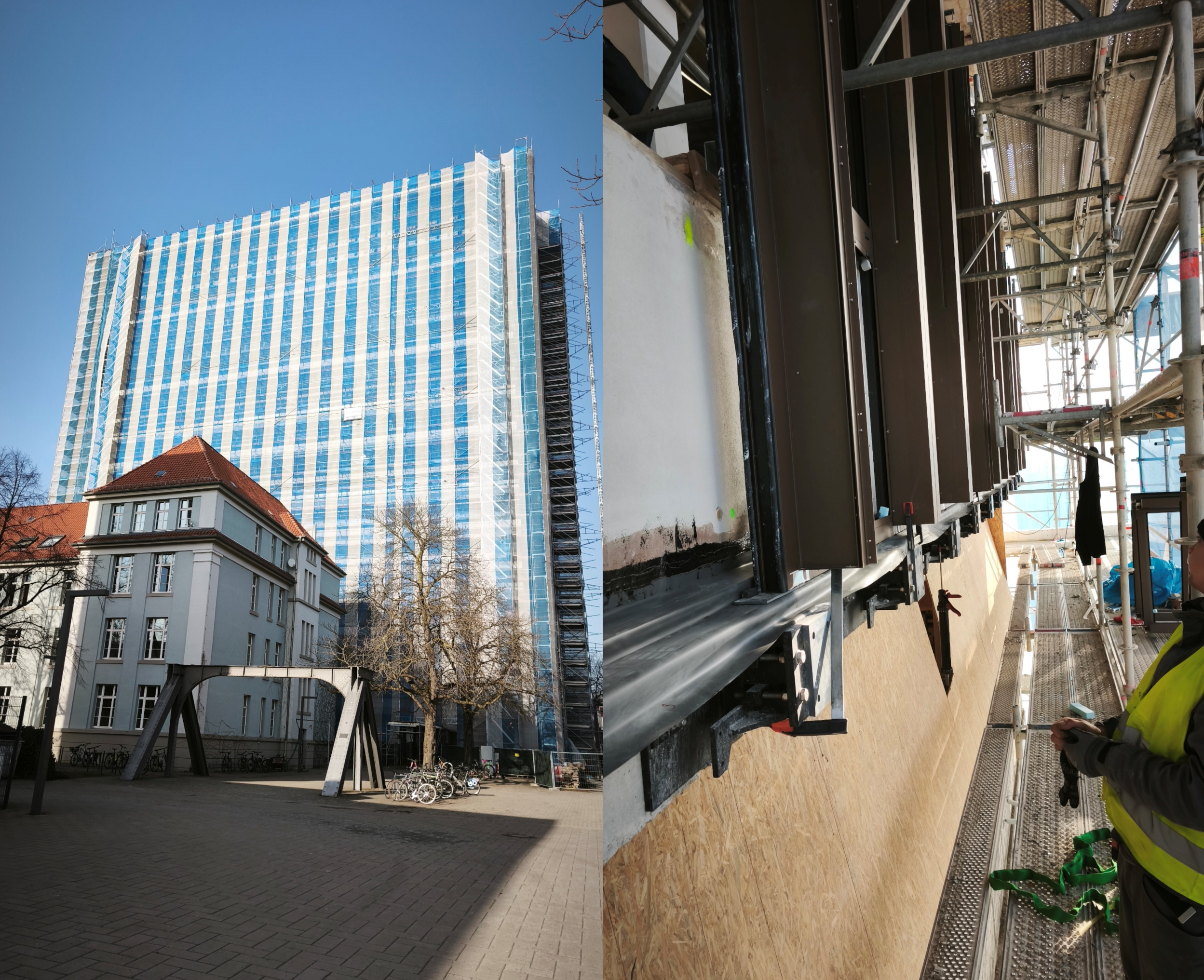 Die Montage der neuen Elemente zur Sanierung der Fassade des Hochhauses Gebäude 3408, der Leibniz Universität Hannover (LUH), hat bereits begonnen und erfolgt in einem kontinuierlichen Takt. Insgesamt ist eine Fassadenfläche von rund 12.000 m2, während des weiterhin im Gebäude laufenden Lehrbetriebs, zu bearbeiten. Wir sind stolz, Teil des Projektteams zu sein und dadurch aktiv zum Erfolg des Projektes beitragen zu können.